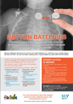Kidsafe Victoria, in partnership with Safer Care Victoria and the Victorian Paediatric Clinical Network, have developed a range of resources to raise awareness of the dangers posed by button batteries and the need for urgent medical care. Resources include a poster for Clinicians, a poster for General Practitioners and poster and DL brochure for parents and carers. To download a free copy of the resources, please click on the links below.
